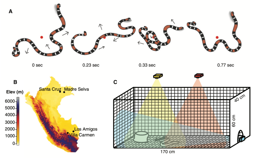 To explore this theory, Dr. Moore and their team went to Peru and collected thrash dance videos from 25 wild coral snakes from 5 different species and 4 different locations. The snakes were exposed to different stimuli representing 1) a bird flying overhead (looming stimulus), 2) a large mammal walking nearby (vibration stimulus), and 3) a predator attack (contact stimulus). From these videos, the team analyzed the variation in color patterns and thrash dances within and among species, sizes, and locations.