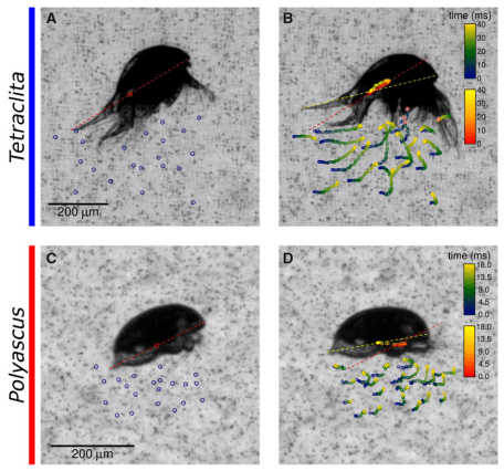They found that the rounder Polyascus were more hydrodynamic than the Tetraclita nauplii, meaning they could move more easily through the water, and they were able to swim more quickly. Polyascus also used more synchronous limb movements that moved less water than Tetraclita, making them essentially quieter and less likely to be detected by a predator. However, by moving their limbs out of synch, Tetraclita are able to direct water flow toward their mouthparts, helping them capture food.