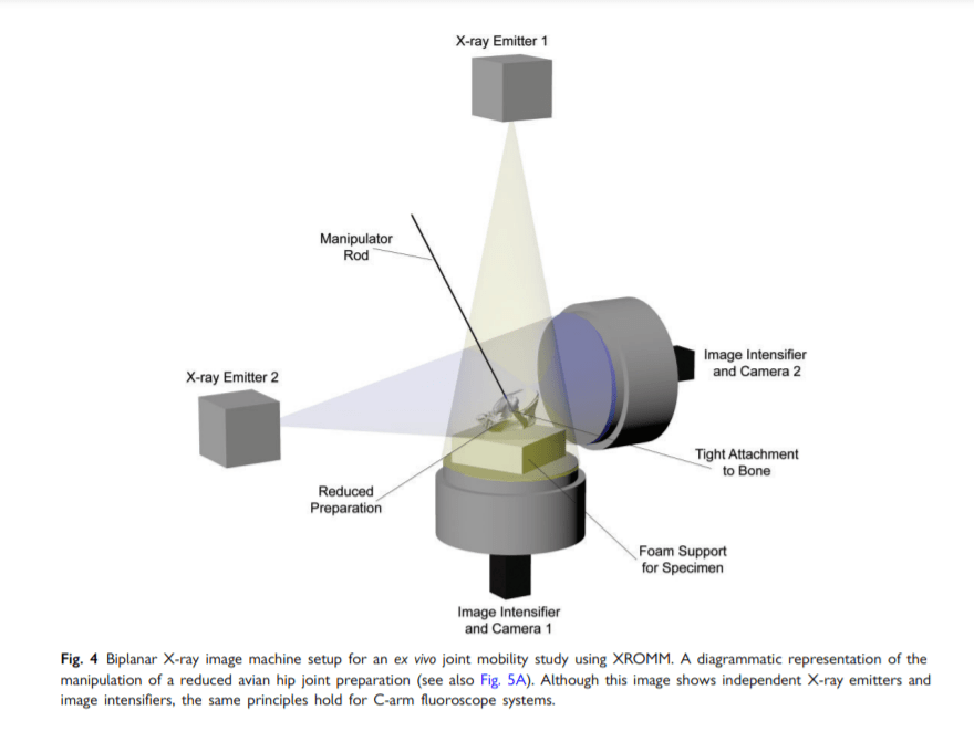 The paper outlines the qualifications for obtaining and preparing a good cadaver specimen, how to implant markers and position manipulators (see image below), how to collect X-ray data, track and manipulate it, and even the technical aspects of calculating six degree-of-freedom joint mobility. As ex-vivo XROMM studies continue to increase, Manafzadeh’s paper will provide a helpful and much needed workflow.