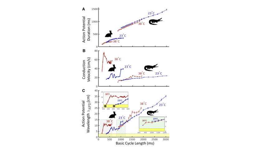 Effective cardiac function relies on steady heartbeats, produced by the coordination of electrical and chemical signals within the body. Major interruptions may introduce ventricular fibrillation (a type of arrhythmia, or irregular heartbeats) and potentially cause heart failure. Luckily, our hearts have a built-in safety function (long action potential wavelengths) to help reduce the risk of ventricular fibrillation. Unfortunately, increased heart rates reduce action potential wavelengths and increase the risk of arrhythmia. For mammals that often have high heart rates under extreme temperatures, this is not so good. For alligators and other ectotherms that operate under a wide range of temperatures, it is unclear how their hearts react and continue to function.