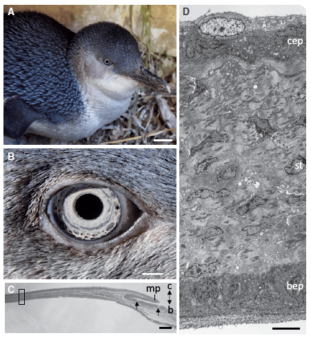 Figure 1 from Collins and Collins (2020). A) An adult little penguin, B) The little penguin eye (beak is to the right), C) A cross section through the nictitating membrane, c= outer (conjunctival) membrane and b=inner (bulbar) membrane, D) A close-up of the rectangle in C, cep= outer membrane, st=connective tissue stroma, bep=inner (bulbar) membrane. Scale bars: (A) 25 micrometers; (B) 40 micrometers; (C) 50 micrometers; and (D) 50 micrometers.