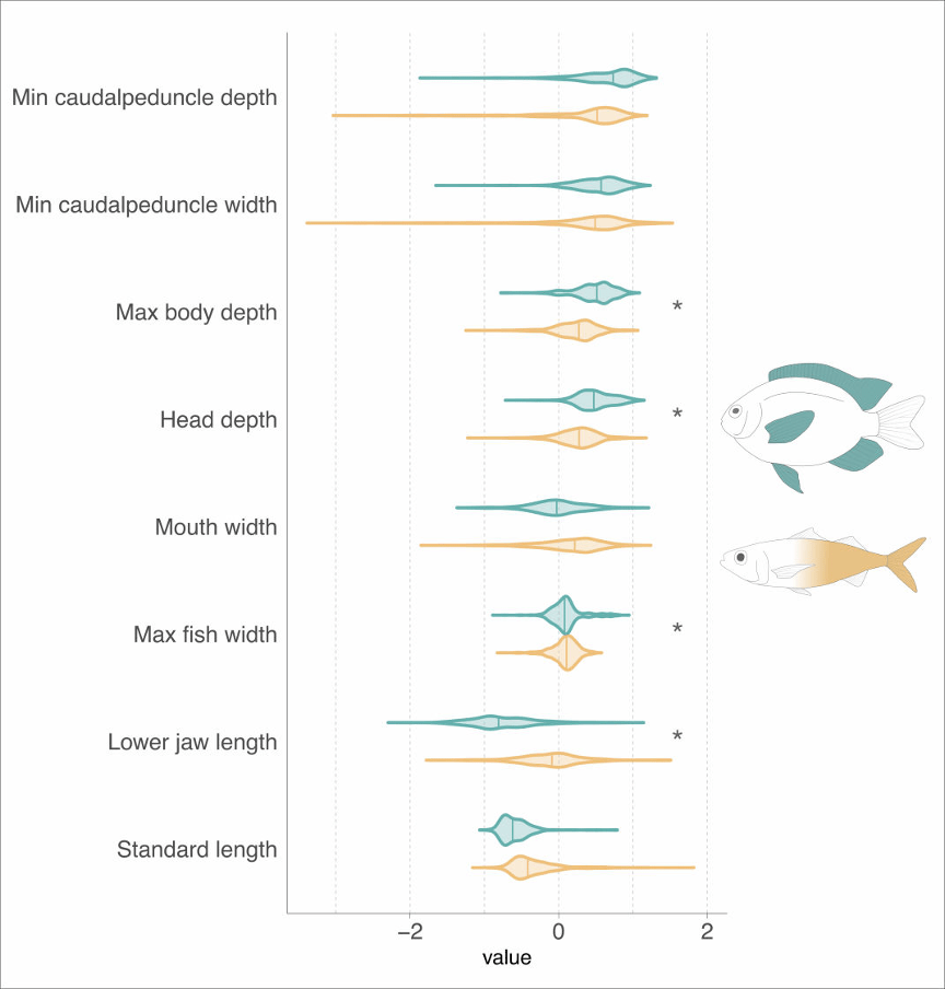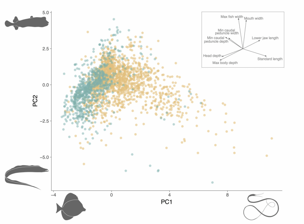 Over the past century, a large body of observational and experimental research has suggested a strong relationship between swimming mode and fish body shape exists, although empirical validation of this idea had yet to occur. This changed recently when a team of scientists led by Dr. Sarah Friedman took a deep dive into the fish locomotion pool. In a study published in Integrative and Organismal Biology, Friedman and colleagues tested long-standing expectations of swimming mode’s relationship to body size using a large dataset consisting of 2295 marine fish species found in demersal (on or near the bottom) and pelagic (open water) habitats. The authors measured eight body traits for each species, with the average value of three adult specimens calculated for each species (see Figure 1).