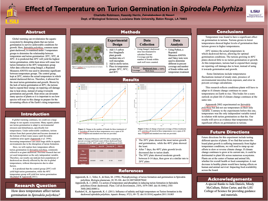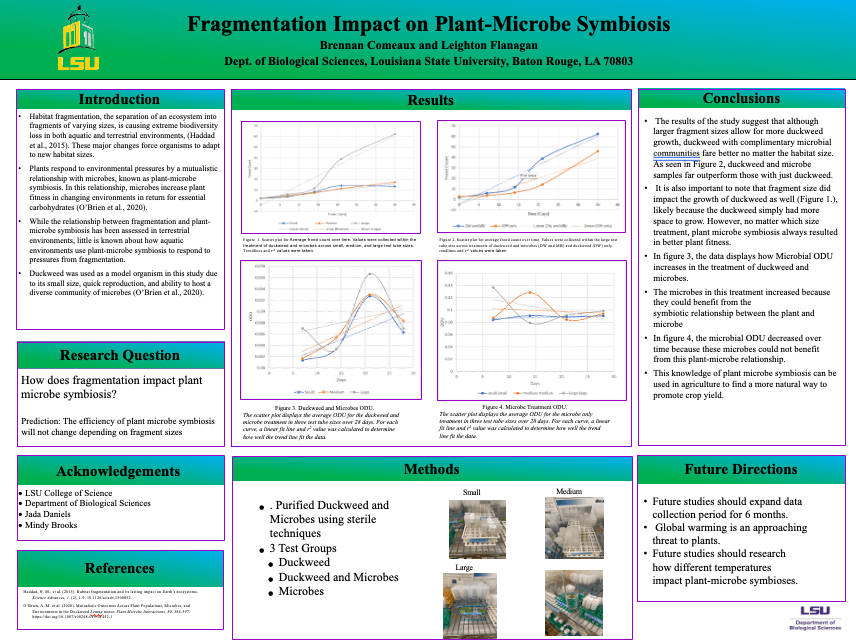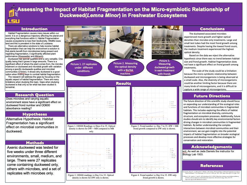 Their research led to some genuinely eye-opening results that felt like a step forward in our understanding. Here’s the gist: they took duckweed strains from three distinct habitats of varying sizes—small, medium, and large—and cultivated them in test tubes corresponding to those sizes. With both a microbial and non-microbial treatment, they let them grow for five weeks. The data revealed some very interesting patterns. Regardless of the microbial treatment or test tube size, it was consistently observed that microbial communities derived from the largest habitat exhibited the highest microbial density. Moreover, in the larger test tubes, duckweed consistently showed a notable rise in biomass, regardless of its source habitat or the given treatment. A clear trend was that duckweed’s growth rate was consistently higher when paired with microbial entities than when grown alone. Through the unique opportunities provided by CURE, we were able to achieve remarkable results not typically seen in traditional labs. Plus, the cherry on top? Students got to show off their work to the entire university at a poster session.