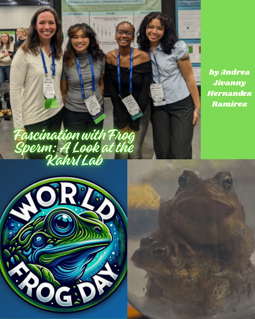 Scientist and Blogger(SICB Mangum recipient) Andrea Jivanny Hernandez Ramirez (On the far right) is a junior at Hamilton College pursuing a B.A. in biophysics with a minor in math. As a poster presenter at SICB 2026, Andrea Jivanny presented on a research project from the summer with Dr. Ariel Kahrl in the Biology department. They were looking at the performance and longevity effects of egg jelly on sperm in green frogs. Since then Andrea Jivanny has begun research on flagellar motion of anuran sperm to incorporate more biophysics in her work.